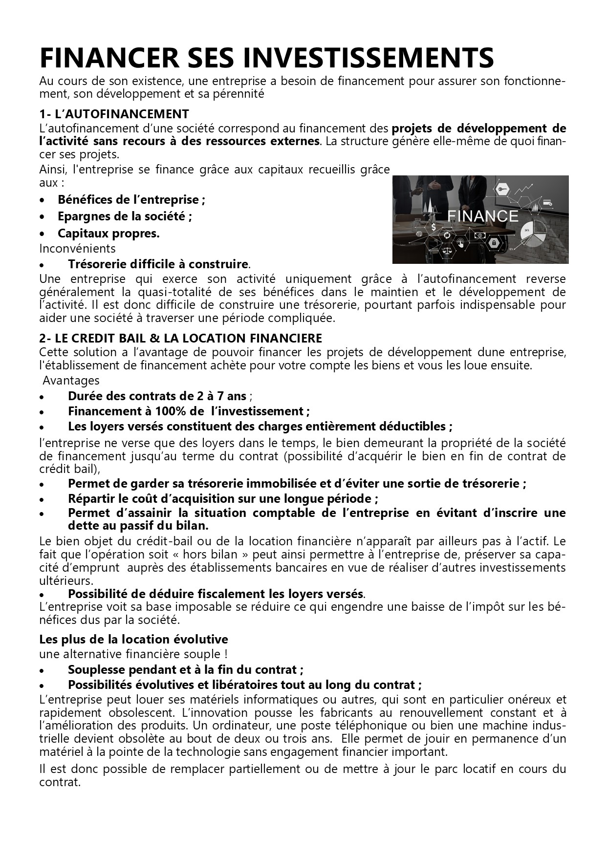 FINANCER SES INVESTISSEMENTS Au cours de son existence, une entreprise a besoin de financement pour assurer son fonctionnement, son développement et sa pérennité. L’AUTOFINANCEMENT L’autofinancement d’une société correspond au financement des projets de développement de l’activité sans recours à des ressources externes. La structure génère elle-même de quoi financer ses projets. Ainsi, l'entreprise se finance grâce aux capitaux recueillis grâce aux : Bénéfices de l’entreprise ; Epargnes de la société ; Capitaux propres. Inconvénients Trésorerie difficile à construire. Une entreprise qui exerce son activité uniquement grâce à l’autofinancement reverse généralement la quasi-totalité de ses bénéfices dans le maintien et le développement de l’activité. Il est donc difficile de construire une trésorerie, pourtant parfois indispensable pour aider une société à traverser une période compliquée. LE CREDIT BAIL & LA LOCATION FINANCIERE Cette solution a l’avantage de pouvoir financer les projets de développement dune entreprise, l'établissement de financement achète pour votre compte les biens et vous les loue ensuite. Avantages Durée des contrats de 2 à 7 ans ; Financement à 100% de l’investissement ; Les loyers versés constituent des charges entièrement déductibles ; l’entreprise ne verse que des loyers dans le temps, le bien demeurant la propriété de la société de financement jusqu’au terme du contrat (possibilité d’acquérir le bien en fin de contrat de crédit bail), Permet de garder sa trésorerie immobilisée et d’éviter une sortie de trésorerie ; Répartir le coût d’acquisition sur une longue période ; Permet d’assainir la situation comptable de l’entreprise en évitant d’inscrire une dette au passif du bilan. Le bien objet du crédit-bail ou de la location financière n’apparaît par ailleurs pas à l’actif. Le fait que l’opération soit « hors bilan » peut ainsi permettre à l’entreprise de, préserver sa capacité d’emprunt auprès des établissements bancaires en vue de réaliser d’autres investissements ultérieurs. Possibilité de déduire fiscalement les loyers versés. L’entreprise voit sa base imposable se réduire ce qui engendre une baisse de l’impôt sur les bénéfices dus par la société. LA LOCATION FINANCIERE une alternative financière souple ! Souplesse pendant et à la fin du contrat ; Possibilités évolutives et libératoires tout au long du contrat ; L’entreprise peut louer ses matériels informatiques ou autres, qui sont en particulier onéreux et rapidement obsolescent. L’innovation pousse les fabricants au renouvellement constant et à l’amélioration des produits. Un ordinateur, une poste téléphonique ou bien une machine industrielle devient obsolète au bout de deux ou trois ans. Elle permet de jouir en permanence d’un matériel à la pointe de la technologie sans engagement financier important. Il est donc possible de remplacer partiellement ou de mettre à jour le parc locatif en cours du contrat. Possibilité d’externalisation totale du service y afférant, à savoir l’entretien, la mise à jour, l’assurance, SAV, etc.