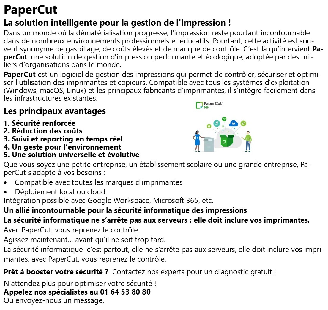 PaperCut La solution intelligente pour la gestion de l'impression Dans un monde où la dématérialisation progresse, l'impression reste pourtant incontournable dans de nombreux environnements professionnels et éducatifs. Pourtant, cette activité est souvent synonyme de gaspillage, de coûts élevés et de manque de contrôle. C’est là qu’intervient PaperCut, une solution de gestion d'impression performante et écologique, adoptée par des milliers d'organisations dans le monde. PaperCut est un logiciel de gestion des impressions qui permet de contrôler, sécuriser et optimiser l’utilisation des imprimantes et copieurs. Compatible avec tous les systèmes d’exploitation (Windows, macOS, Linux) et les principaux fabricants d’imprimantes, il s’intègre facilement dans les infrastructures existantes. Les principaux avantages 1. Sécurité renforcée 2. Réduction des coûts 3. Suivi et reporting en temps réel 4. Un geste pour l’environnement 5. Une solution universelle et évolutive Que vous soyez une petite entreprise, un établissement scolaire ou une grande entreprise, PaperCut s’adapte à vos besoins : • Compatible avec toutes les marques d'imprimantes • Déploiement local ou cloud • Intégration possible avec Google Workspace, Microsoft 365, etc. Un allié incontournable pour la sécurité informatique des impressions La sécurité informatique ne s’arrête pas aux serveurs : elle doit inclure vos imprimantes. Avec PaperCut, vous reprenez le contrôle. Agissez maintenant… avant qu’il ne soit trop tard.