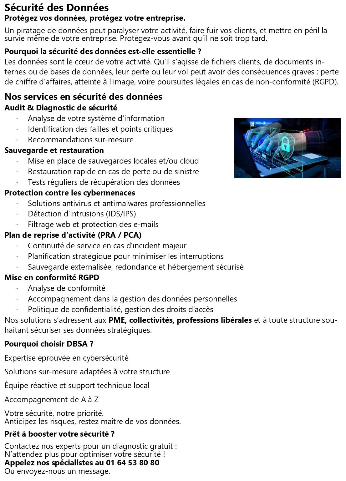 Sécurité des Données Protégez vos données, protégez votre entreprise. Un piratage de données peut paralyser votre activité, faire fuir vos clients, et mettre en péril la survie même de votre entreprise. Protégez-vous avant qu’il ne soit trop tard. Pourquoi la sécurité des données est-elle essentielle ? Les données sont le cœur de votre activité. Qu’il s’agisse de fichiers clients, de documents internes ou de bases de données, leur perte ou leur vol peut avoir des conséquences graves : perte de chiffre d’affaires, atteinte à l’image, voire poursuites légales en cas de non-conformité (RGPD). Nos services en sécurité des données Audit & Diagnostic de sécurité · Analyse de votre système d'information · Identification des failles et points critiques · Recommandations sur-mesure Sauvegarde et restauration · Mise en place de sauvegardes locales et/ou cloud · Restauration rapide en cas de perte ou de sinistre · Tests réguliers de récupération des données Protection contre les cybermenaces · Solutions antivirus et antimalwares professionnelles · Détection d’intrusions (IDS/IPS) · Filtrage web et protection des e-mails Plan de reprise d’activité (PRA / PCA) · Continuité de service en cas d’incident majeur · Planification stratégique pour minimiser les interruptions · Sauvegarde externalisée, redondance et hébergement sécurisé Mise en conformité RGPD · Analyse de conformité · Accompagnement dans la gestion des données personnelles · Politique de confidentialité, gestion des droits d’accès Nos solutions s’adressent aux PME, collectivités, professions libérales et à toute structure souhaitant sécuriser ses données stratégiques. Pourquoi choisir DBSA ? Expertise éprouvée en cybersécurité Solutions sur-mesure adaptées à votre structure Équipe réactive et support technique local Accompagnement de A à Z Votre sécurité, notre priorité. Anticipez les risques, restez maître de vos données. Prêt à booster votre sécurité ? Contactez nos experts pour un diagnostic gratuit : N’attendez plus pour optimiser votre sécurité ! Appelez nos spécialistes au 01 64 53 80 80 Ou envoyez-nous un message.