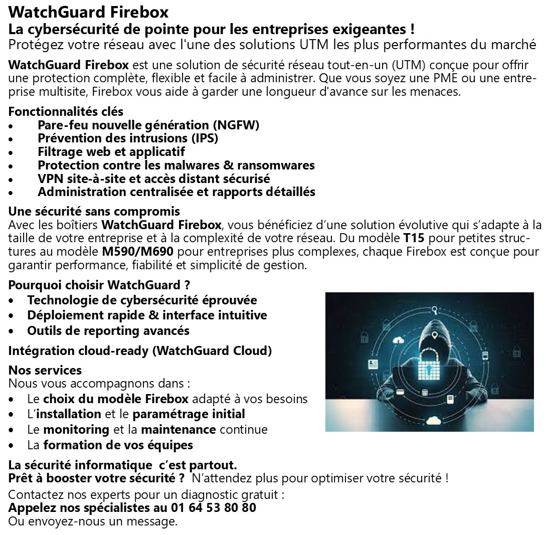 WatchGuard Firebox La cybersécurité de pointe pour les entreprises exigeantes Protégez votre réseau avec l'une des solutions UTM les plus performantes du marché WatchGuard Firebox est une solution de sécurité réseau tout-en-un (UTM) conçue pour offrir une protection complète, flexible et facile à administrer. Que vous soyez une PME ou une entreprise multisite, Firebox vous aide à garder une longueur d'avance sur les menaces. Fonctionnalités clés Pare-feu nouvelle génération (NGFW) Prévention des intrusions (IPS) Filtrage web et applicatif Protection contre les malwares & ransomwares VPN site-à-site et accès distant sécurisé Administration centralisée et rapports détaillés Une sécurité sans compromis Avec les boîtiers WatchGuard Firebox, vous bénéficiez d’une solution évolutive qui s’adapte à la taille de votre entreprise et à la complexité de votre réseau. Du modèle T15 pour petites structures au modèle M590/M690 pour entreprises plus complexes, chaque Firebox est conçue pour garantir performance, fiabilité et simplicité de gestion. Pourquoi choisir WatchGuard ? • Technologie de cybersécurité éprouvée • Déploiement rapide & interface intuitive • Outils de reporting avancés • Intégration cloud-ready (WatchGuard Cloud) Nos services Nous vous accompagnons dans : • Le choix du modèle Firebox adapté à vos besoins • L’installation et le paramétrage initial • Le monitoring et la maintenance continue • La formation de vos équipes