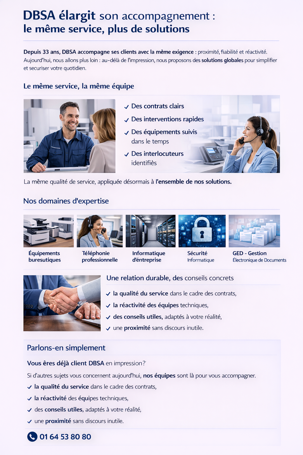 DBSA élargit son accompagnement : le même service, plus de solutions Depuis 33 ans, DBSA accompagne ses clients avec la même exigence : proximité, fiabilité et réactivité. Aujourd’hui, nous allons plus loin : au-delà de l’impression, nous proposons des solutions globales pour simplifier et sécuriser votre quotidien. Le même service, la même équipe Le même service, la même équipe ✓ Des contrats clairs ✓ Des interventions rapides ✓ Des équipements suivis dans le temps ✓ Des interlocuteurs identifiés Téléphonie d'entreprise La même qualité de service, appliquée désormais à l’ensemble de nos solutions. Nos domaines d'expertise Équipements bureautiques Équipements bureautiques Téléphonie professionnelle Téléphonie professionnelle Informatique d'entreprise Informatique d'entreprise Sécurité informatique Sécurité informatique GED - Gestion Électronique de Documents GED - Gestion Électronique de Documents Relation durable Une relation durable, des conseils concrets ✓ la qualité du service dans le cadre des contrats, ✓ la réactivité des équipes techniques, ✓ des conseils utiles, adaptés à votre réalité, ✓ une proximité sans discours inutile. Parlons-en simplement Vous êtes déjà client DBSA en impression ? Si d’autres sujets vous concernent aujourd’hui, nos équipes sont là pour vous accompagner. ✓ la qualité du service dans le cadre des contrats, ✓ la réactivité des équipes techniques, ✓ des conseils utiles, adaptés à votre réalité, ✓ une proximité sans discours inutile. 01 64 53 80 80